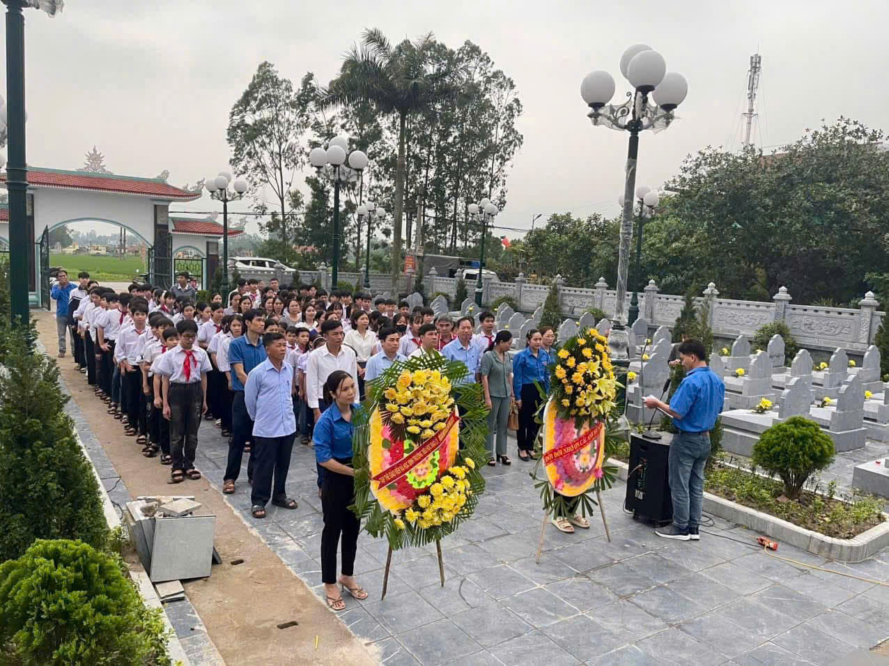 Trong không khí trang nghiêm, thầy cô giáo, đoàn viên thanh niên và các em học sinh đã thành kính dâng hương, dâng hoa và dành phút mặc niệm để tưởng nhớ công lao to lớn của các anh hùng liệt sĩ. Những nén hương thơm được thắp lên không chỉ thể hiện lòng biết ơn mà còn là lời hứa của thế hệ trẻ hôm nay sẽ tiếp bước cha anh, ra sức học tập, rèn luyện để xây dựng quê hương ngày càng giàu đẹp.