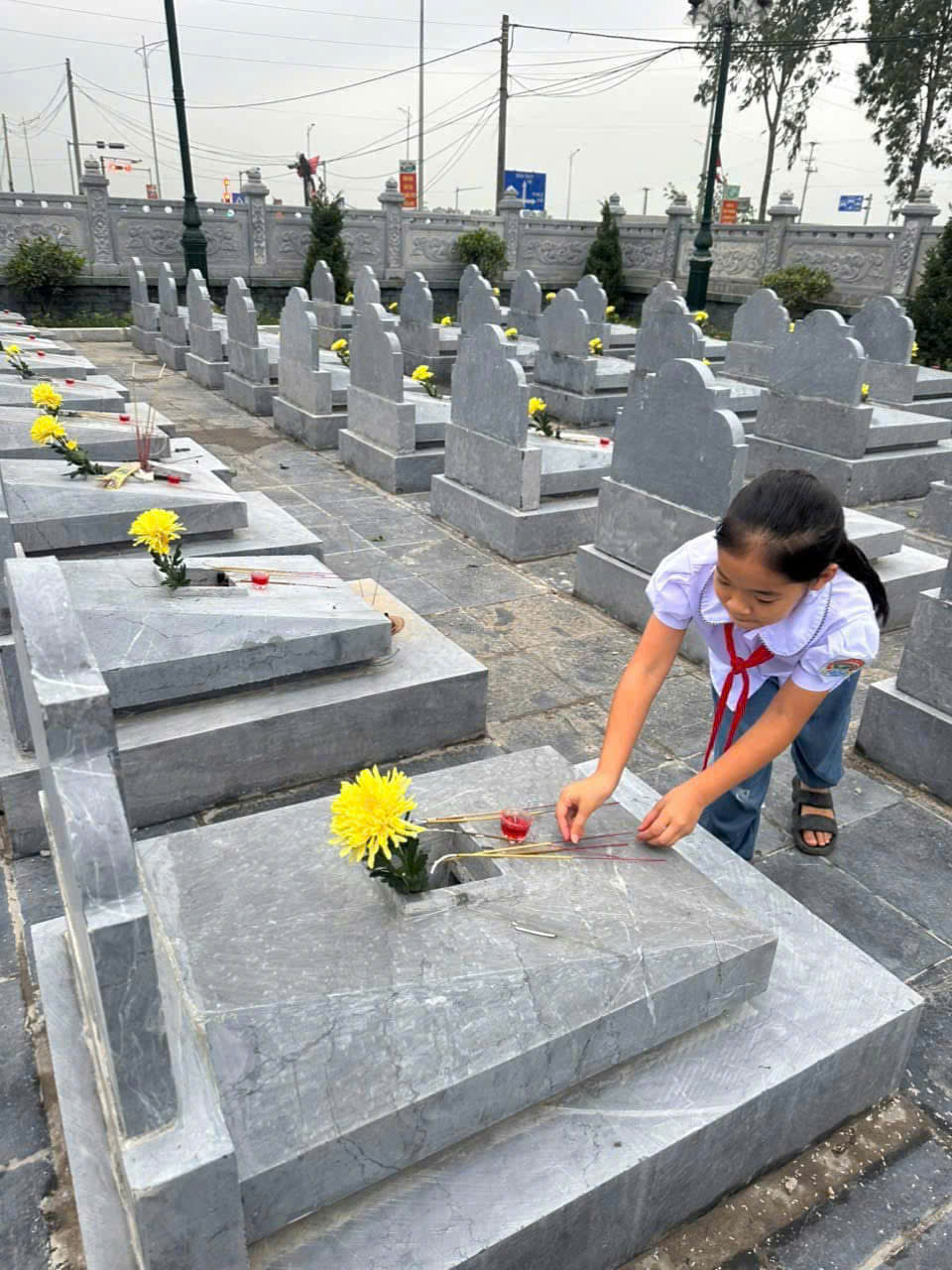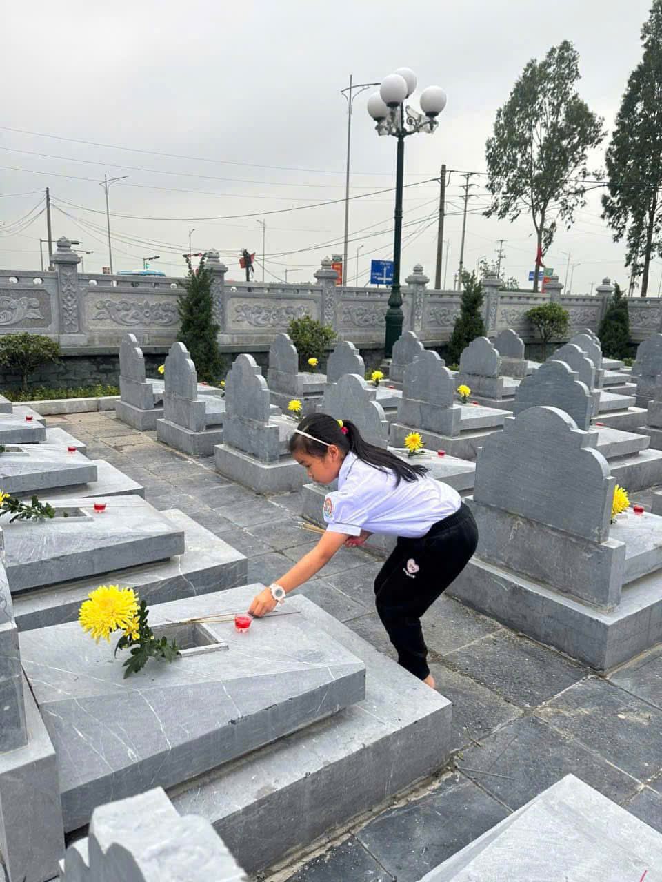 Bên cạnh nghi lễ dâng hương, các em học sinh còn tham gia vệ sinh khuôn viên nghĩa trang, chăm sóc phần mộ liệt sĩ. Những việc làm nhỏ nhưng đầy ý nghĩa đã góp phần thể hiện tinh thần trách nhiệm và lòng tri ân của các em đối với thế hệ đi trước.